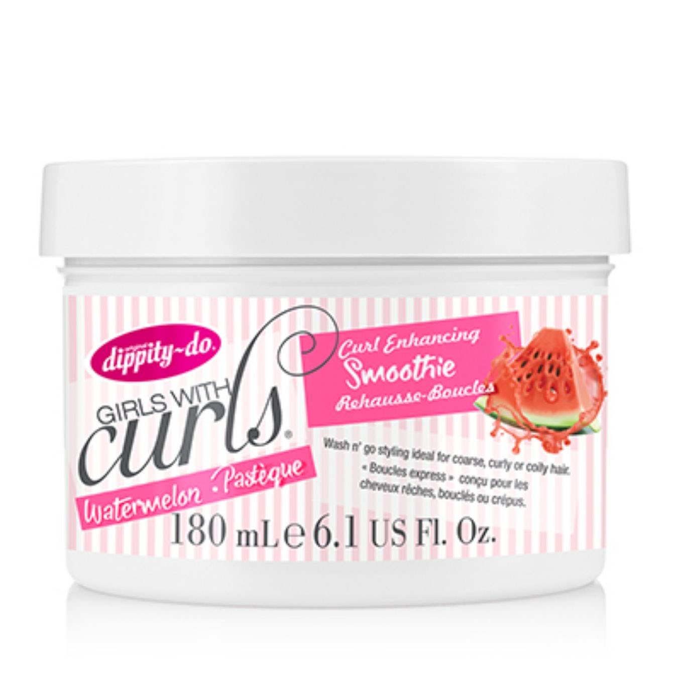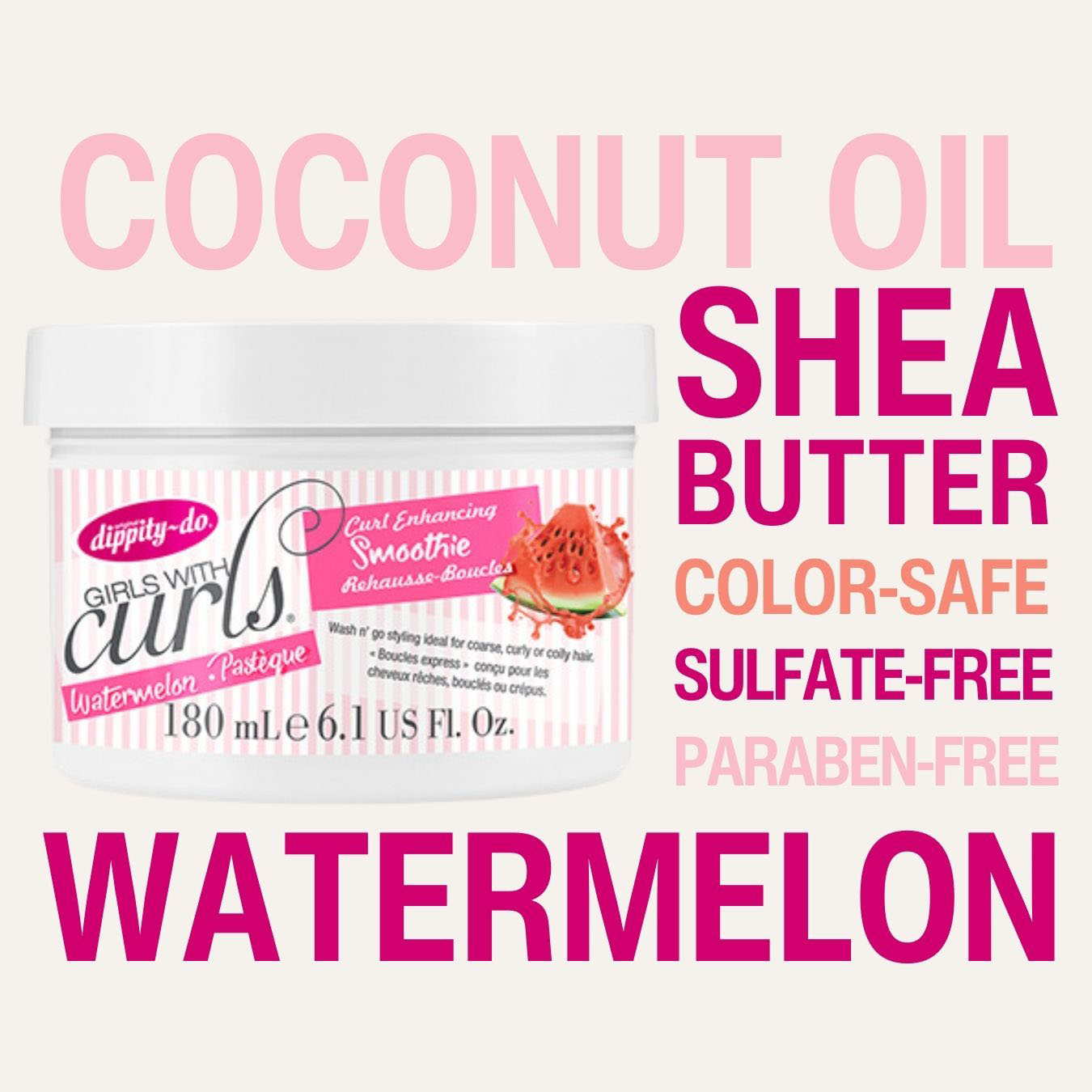 Curl Enhancing Smoothie, watermelon. Wash n’ go styling ideal for coarse, curly or coily hair! This 2-in-1 formula deeply conditions each strand transforming your dull, frizzy hair into beautifully defined curls. This creamy blend of coconut oil & shea butter moisturizes and adds sheen maximizing curl length and preventing shrinkage for longer lasting styles. Also, enhanced with the newest “superfruit” being praised – Watermelon – helping with circulation in the scalp while instantly rehydrating and giving your curls the boost they need!