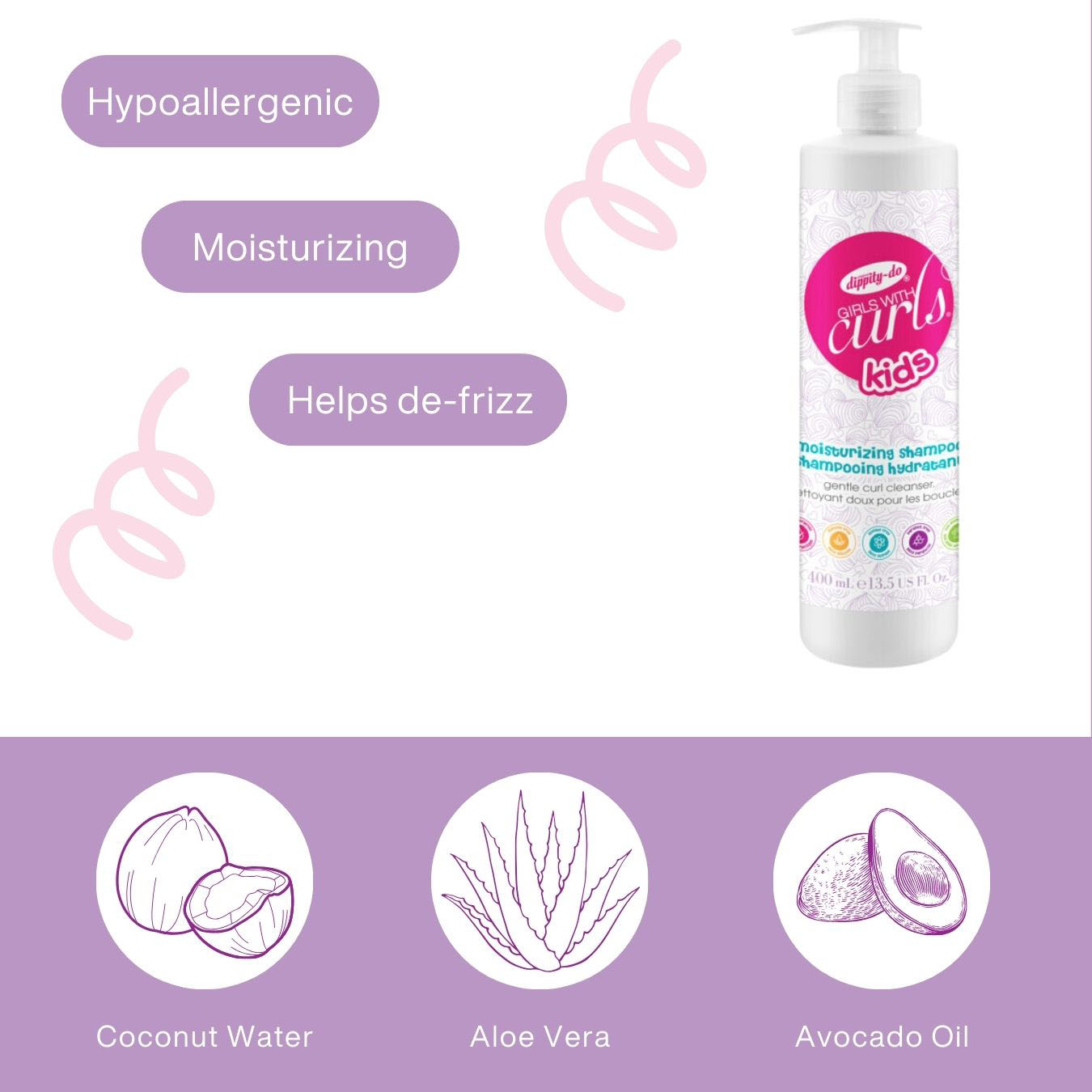 Girls with Curls KIDS Moisturizing Shampoo is the first step to gently care for your family’s textured hair. This hypoallergenic shampoo uses pure coconut water and aloe leaf juice with a frizz fighting, silicone-free blend of natural extracts including: avocado oil, sweet almond oil and hibiscus extract for hassle free wash days.