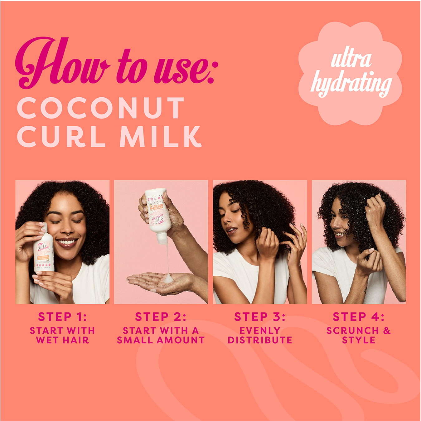 Apply to damp or dry hair from roots to ends. Scrunch to refresh curls and distribute evenly. Use alone for lightweight hydration or layer with Coconut Curl Styling Cream or Coconut Curl Gelée for added moisture, hold, and definition.