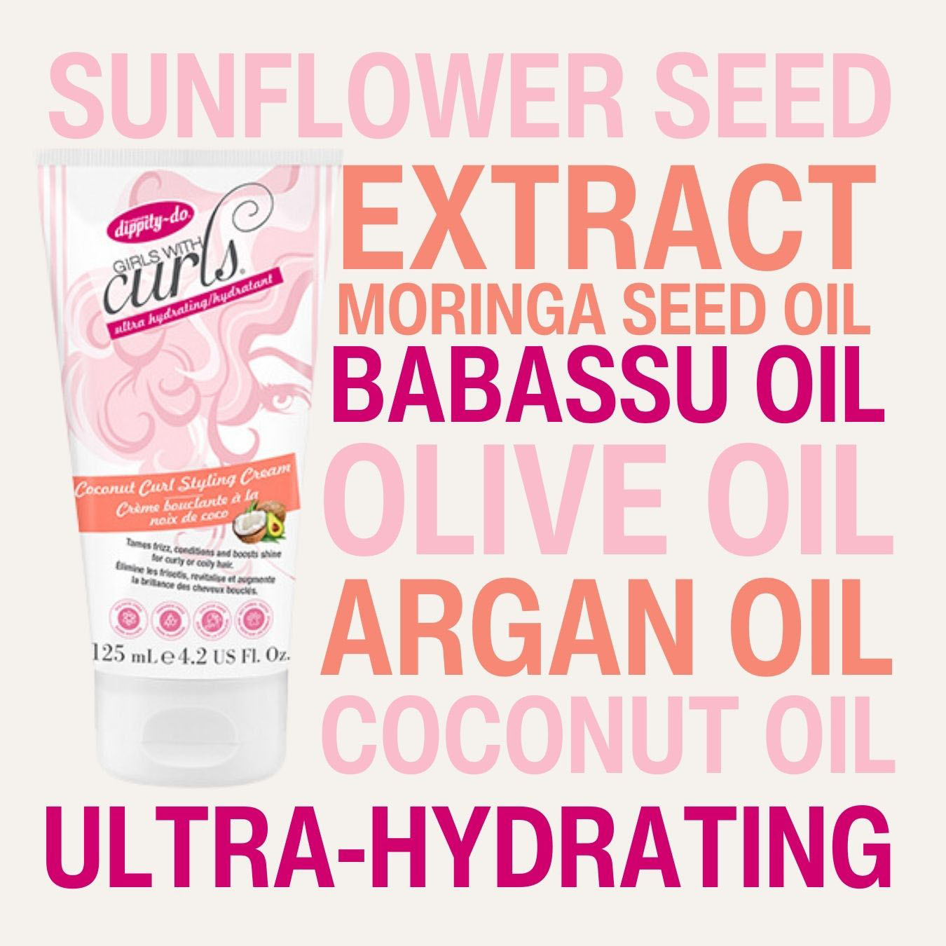 Coconut Curl Styling Cream. A moisture-rich frizz control styling cream that tackles 3 key concerns for curly and coily locks: dryness/ dullness, shrinkage and breakage. Infused with coconut, olive, argan, babassu, and moringa oils to hydrate, shape and tame curly or coily hair